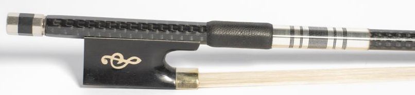 Arco de violino de fibra trançada, peso 61g, com talão de ebano com uma clave de sol inscrutada, com crina animal.